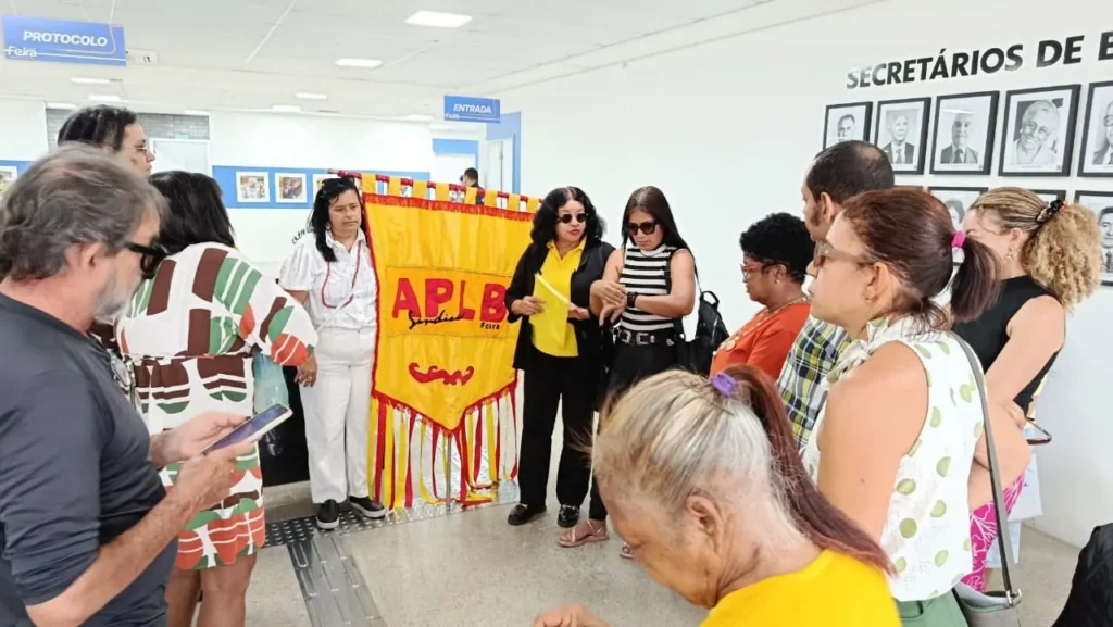 A APLB Feira realizou, na manhã desta quinta-feira (4), uma mobilização na Secretaria Municipal de Educação para cobrar o cumprimento do acordo homologado pelo Tribunal de Justiça após a greve da categoria realizada este ano. A convocação reuniu diversos profissionais da rede municipal, que reivindicam respostas sobre itens que, segundo o sindicato, seguem pendentes.
