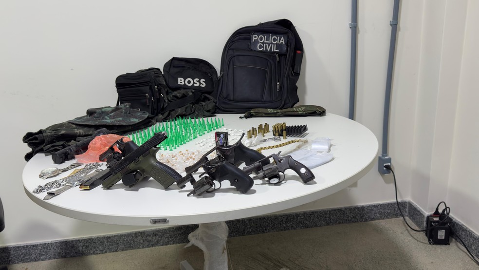 A ação também resultou na apreensão de uma pistola calibre 9 mm com seletor de rajada, três revólveres calibre .38, um revólver calibre .32, dois carregadores de pistola, munições, um rádio comunicador, 184 pinos de cocaína, 200 gramas de crack e roupas camufladas.